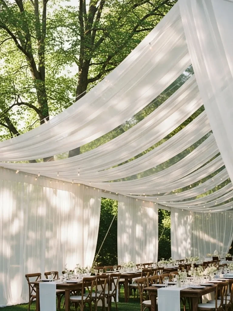 Light fabric panels are draped overhead between trees to create a soft canopy that filters natural light beautifully, with tables underneath that feel intimate while still being open to the surrounding greenery, and gentle fabric movement that adds texture and romance to the space.