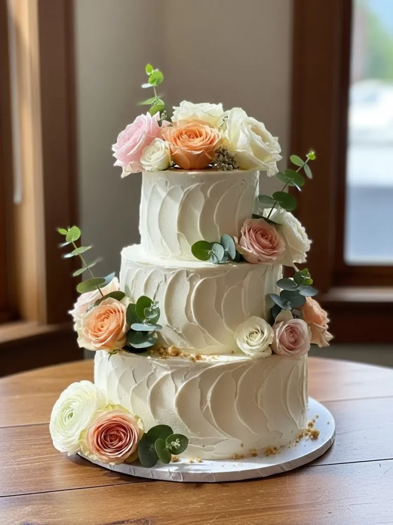 The wedding cake features a classic tiered design with soft textured frosting and gentle curves, decorated with blush and peach florals mixed with fresh greenery that feel light and organic, while the neutral airy color palette lets the flowers shine without overwhelming the design.