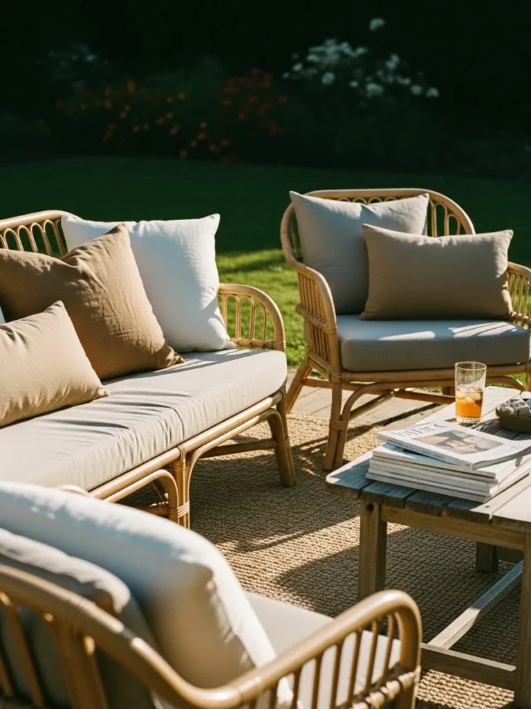 This outdoor seating area is styled with woven chairs, soft neutral cushions, and a low table that feels casual and inviting, with natural materials and muted tones that blend beautifully with the surrounding greenery.