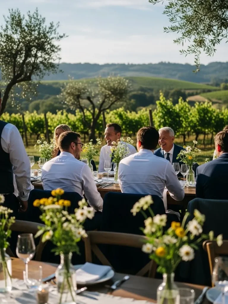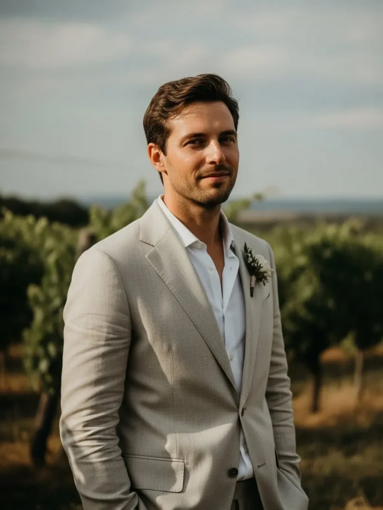 The groom is dressed in a light neutral suit paired with an open collar shirt that feels fresh and relaxed, with a tailored fit that keeps it sharp while the soft color palette blends beautifully with the outdoor vineyard setting.
