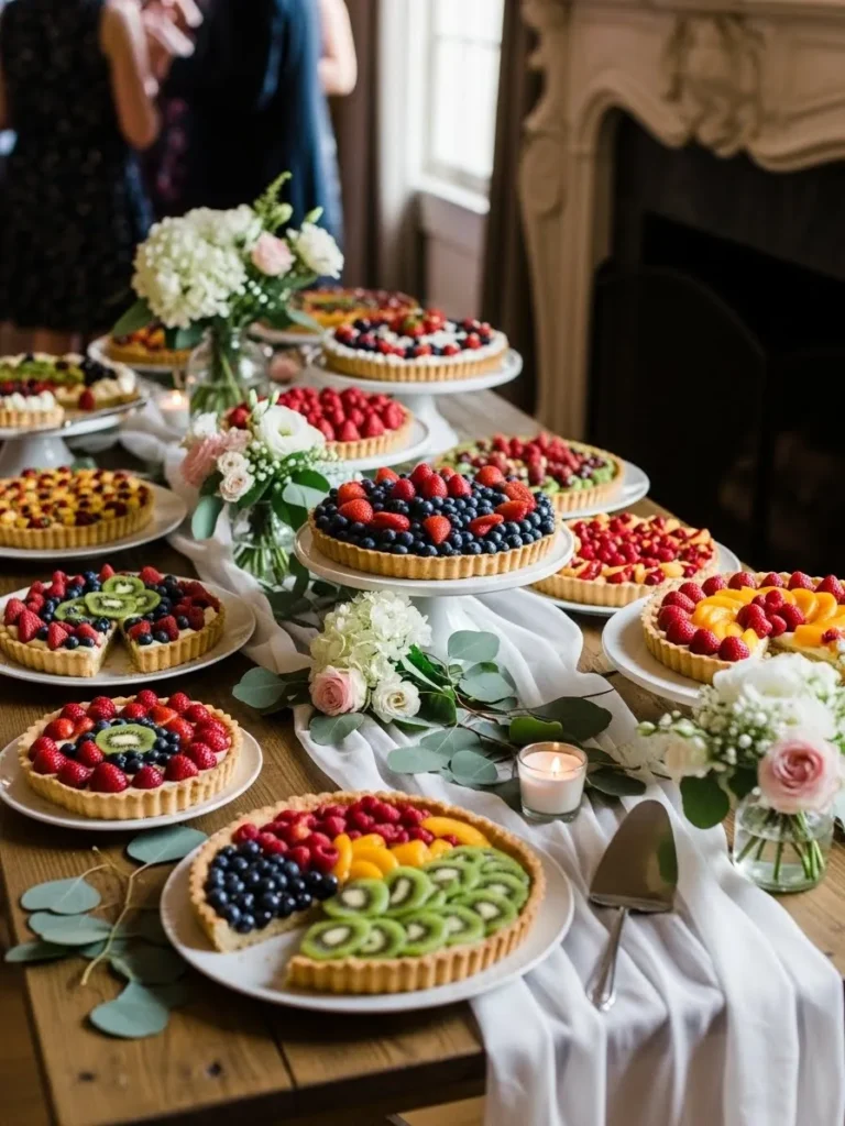 The dessert table is filled with fresh fruit tarts arranged neatly across a long table with soft linens and subtle floral accents, while bright berries and vibrant colors bring a playful energy that feels abundant and joyful without looking cluttered.