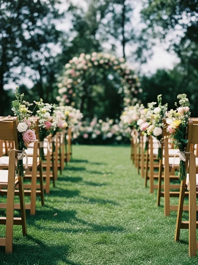 The ceremony aisle is lined with wooden chairs and soft floral arrangements placed along the sides, leading toward a lush green backdrop that feels open and full of light, with flowers arranged naturally rather than overly structured.