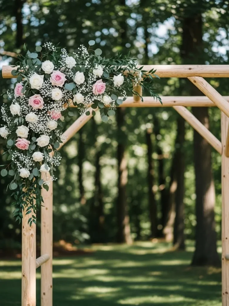 A wooden ceremony arch is decorated with soft blush and white florals mixed with fresh greenery, creating a natural frame that feels light and organic against the forest backdrop, with flowers placed loosely so the structure still feels open and airy.