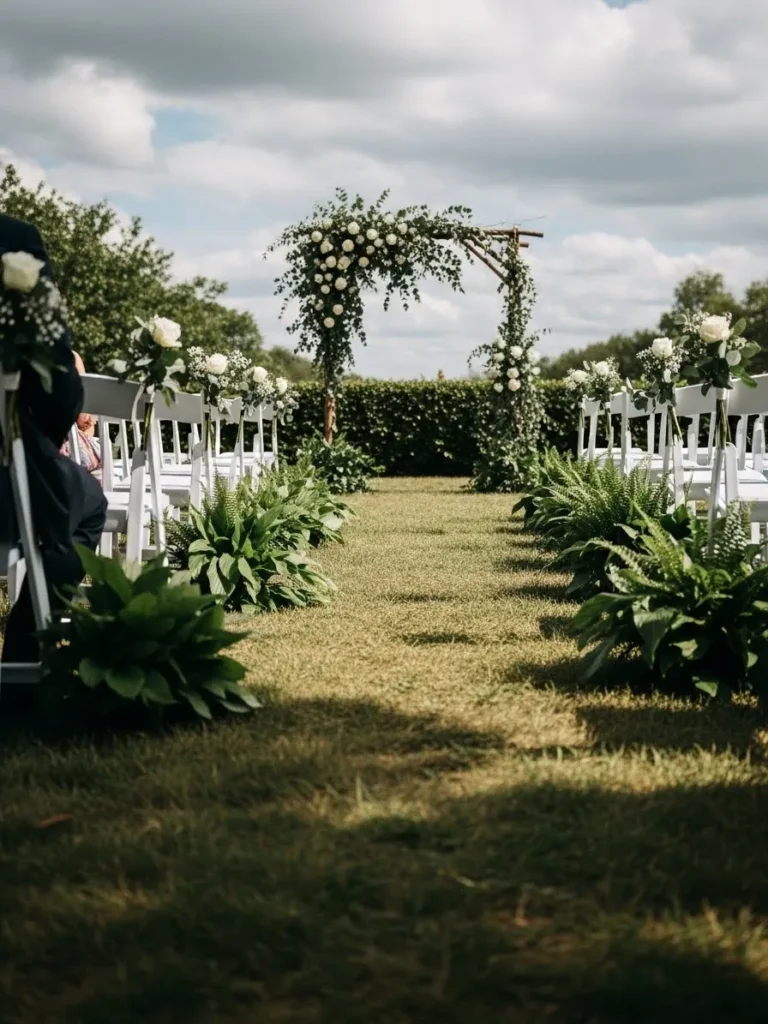The ceremony aisle is set on a grassy lawn with white chairs on each side and lush greenery lining the walkway, leading toward a simple floral arch that blends seamlessly into the outdoor surroundings.