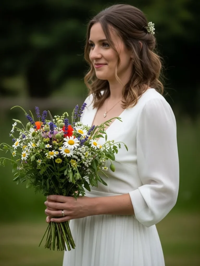 The bride holds a loose wildflower bouquet filled with soft greens and delicate pops of color, with natural stems left visible to enhance the relaxed garden feel, especially when paired with a simple white dress that lets the bouquet stand out.