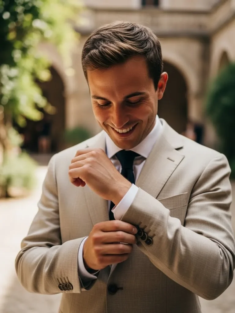The groom wears a light linen suit in a warm neutral tone paired with a crisp shirt and slim tie, with the fabric texture adding a relaxed summer feel while still looking polished, and the casual gesture of adjusting his cuff gives the look an effortless charm that feels candid and natural.