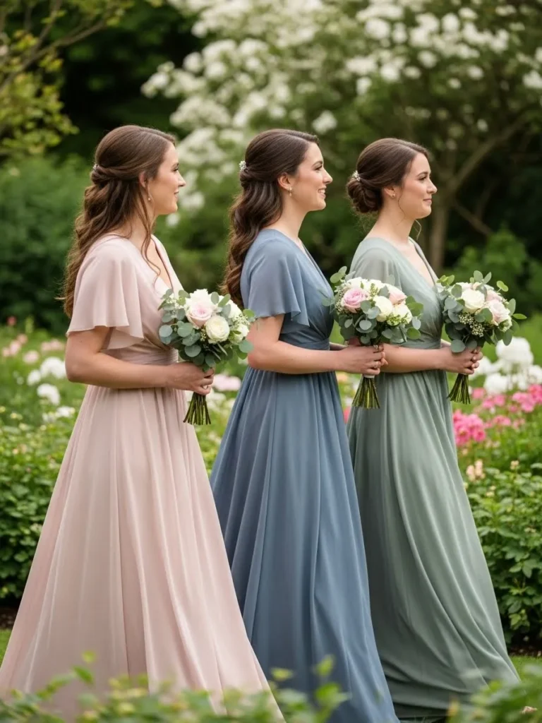 Three bridesmaids walk together wearing flowing dresses in soft pastel tones that complement each other beautifully, with lightweight fabrics that drape effortlessly and move with ease to create a graceful and airy look, while each dress feels slightly unique but still cohesive.