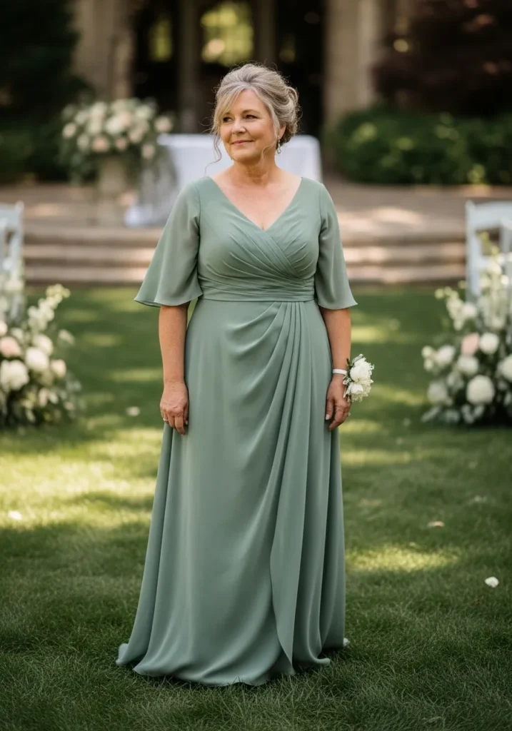 This soft sage green wrap dress features a gently draped bodice, flutter sleeves, and a flowing skirt that moves beautifully with every step. The wrap silhouette creates a natural waist definition while the airy chiffon fabric falls effortlessly, giving the entire look a relaxed yet polished finish that feels perfect for an outdoor spring celebration.