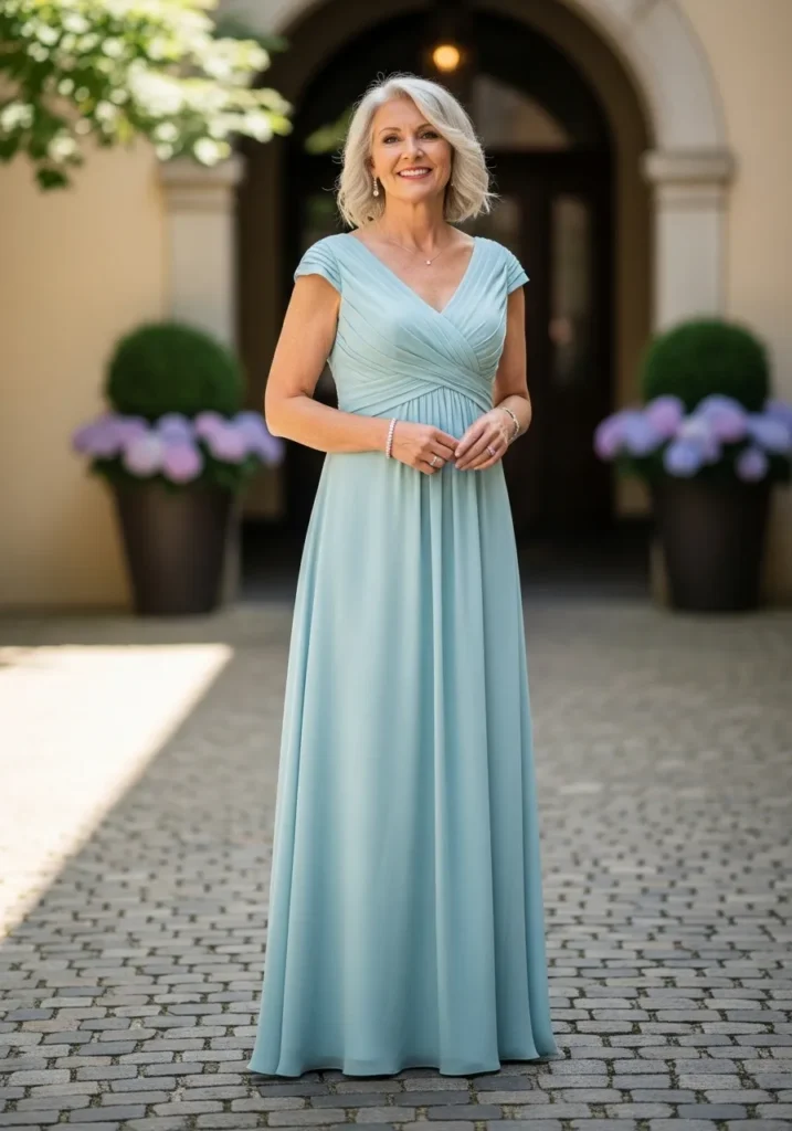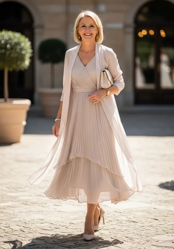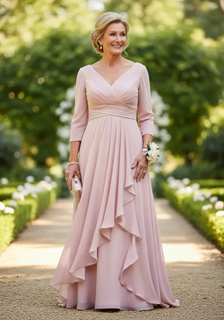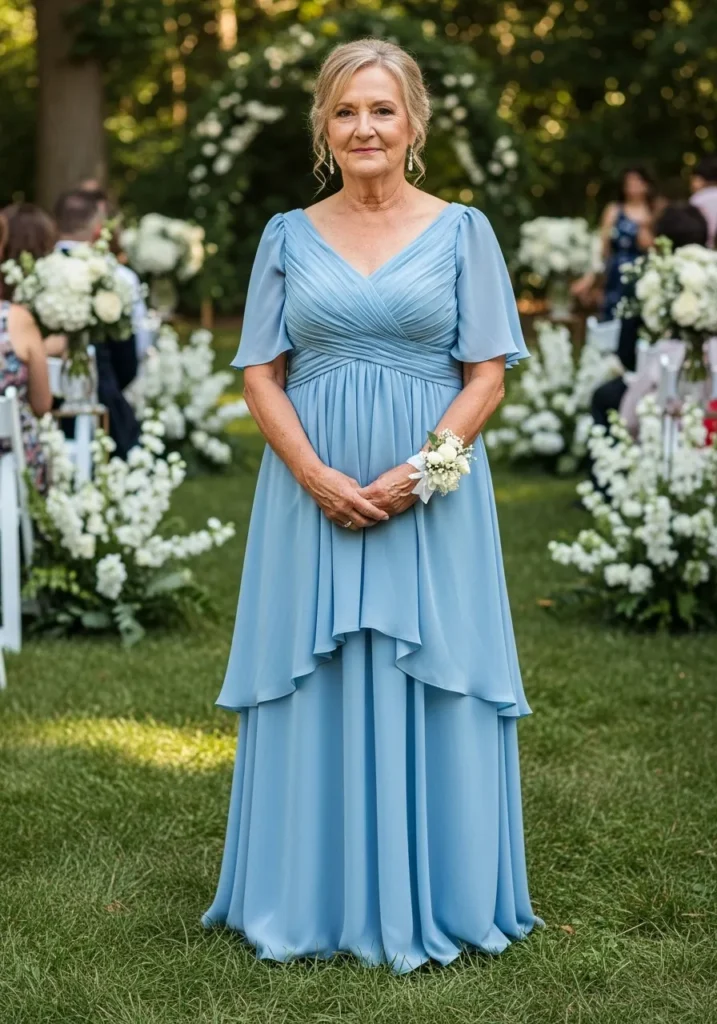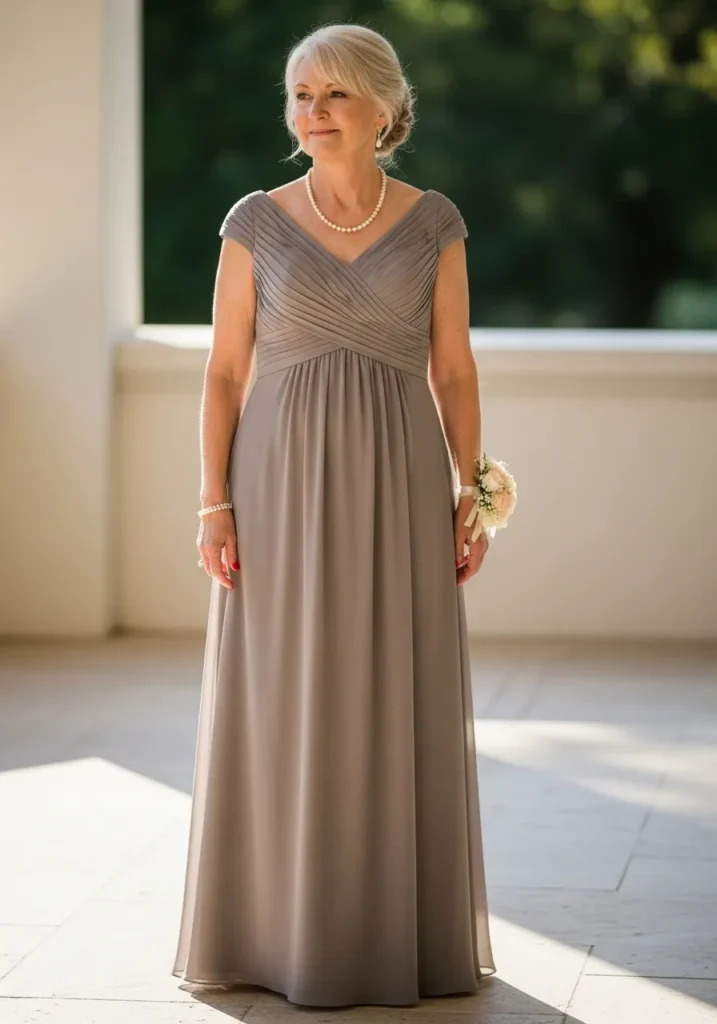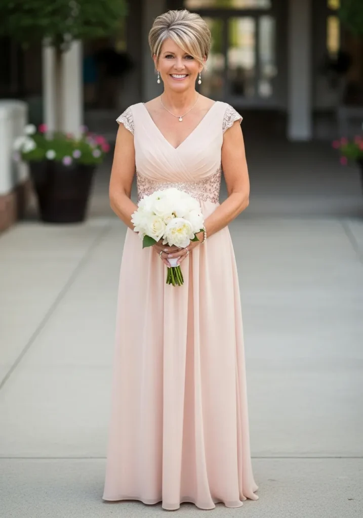 I find this style incredibly charming because it feels soft, relaxed, and elegant all at once. It is the kind of dress that makes you feel instantly comfortable and confident, which is exactly what every mother of the bride deserves.