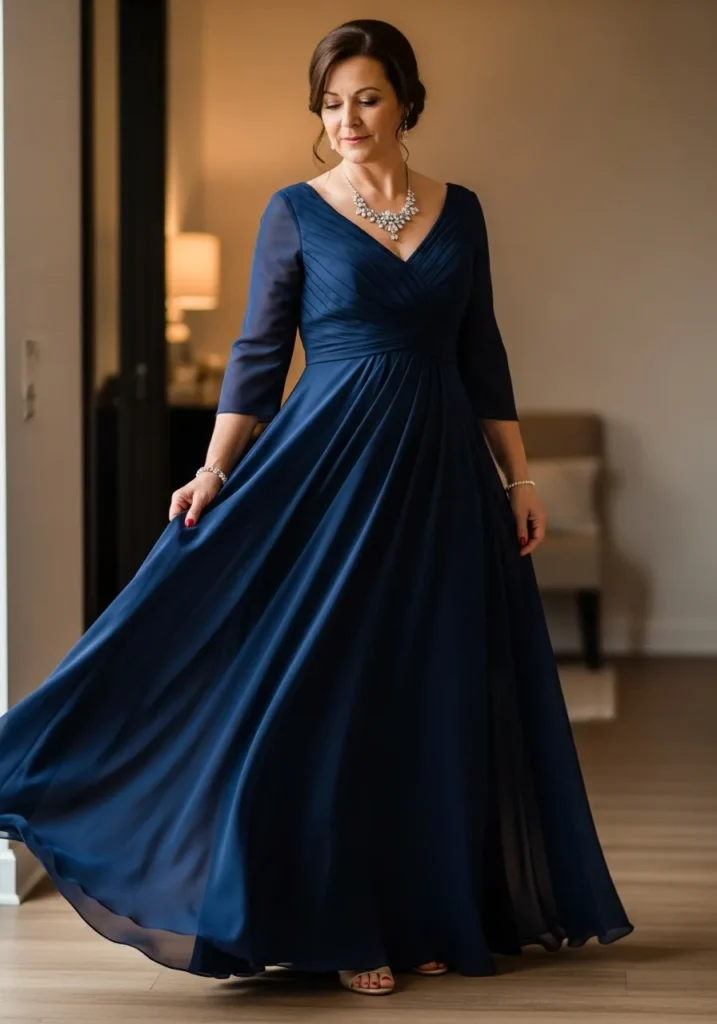 This deep blue gown showcases a wrap-style bodice, three-quarter sleeves, and a sweeping skirt that flows gracefully. The rich color adds depth, while the soft chiffon fabric keeps everything feeling light and wearable.