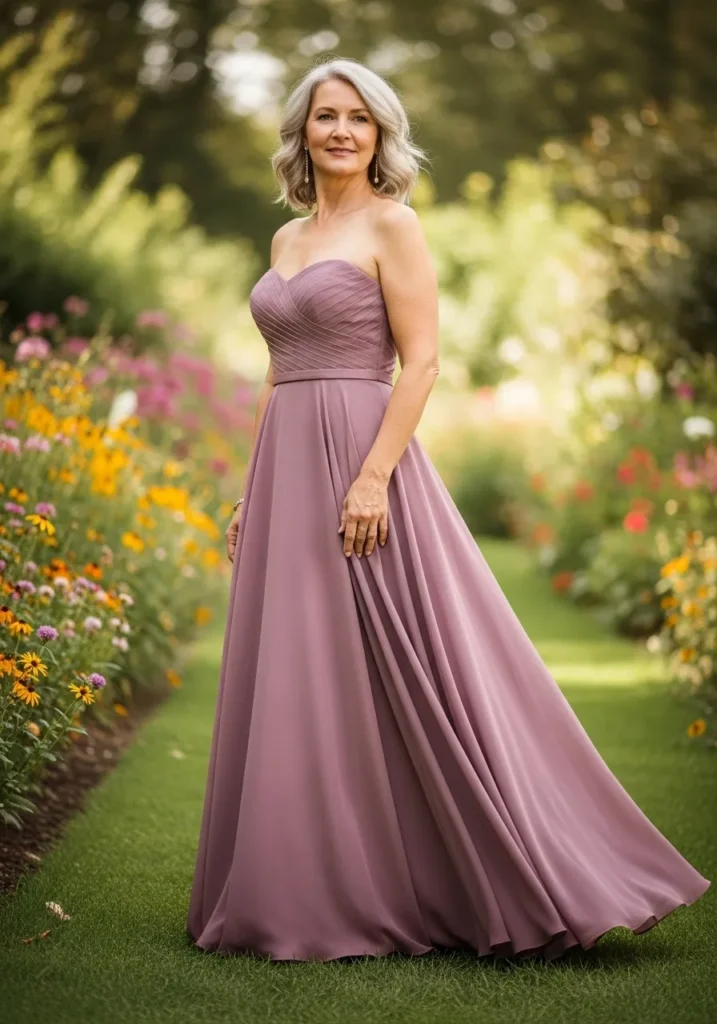 This flowing mauve strapless gown showcases soft pleating across the bodice and a lightweight skirt that sways gracefully through the garden setting. The structured sweetheart neckline adds subtle support, while the airy fabric keeps the overall look romantic and fresh.