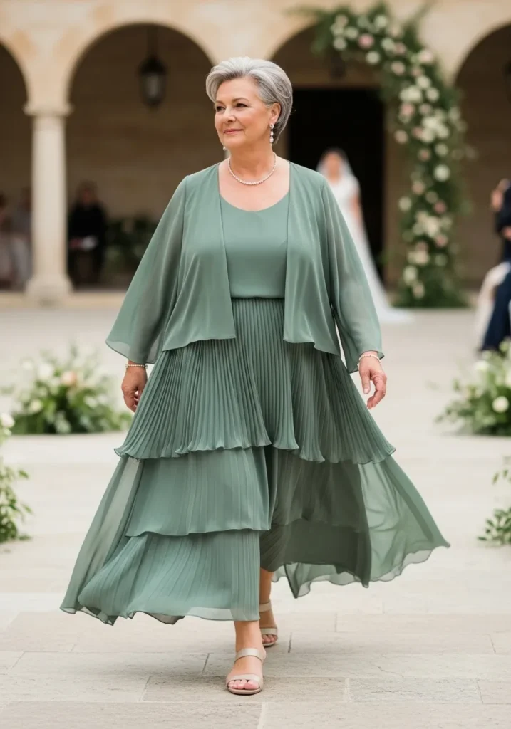 This sage green outfit features a flowing chiffon dress layered with a sheer open-front jacket and a softly pleated tiered skirt that moves beautifully with every step. The lightweight fabric creates gentle movement, while the layered design adds dimension and graceful coverage that feels both elegant and comfortable for a spring wedding setting.