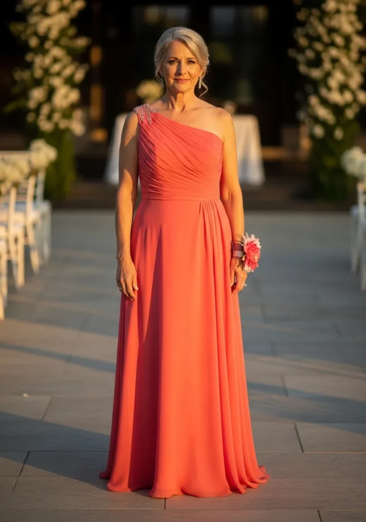 This coral one shoulder gown features diagonal pleating across the bodice, a softly cinched waist, and a flowing skirt that drapes beautifully to the floor. The asymmetrical neckline adds visual interest, while the fabric movement keeps the look light and refined.