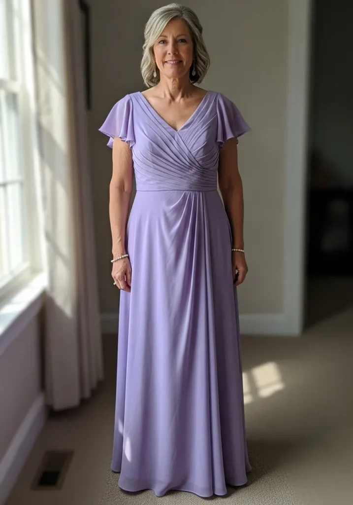 This lavender chiffon gown features soft flutter sleeves, gentle pleating along the bodice, and a flowing skirt that drapes naturally. The pastel shade keeps the look light and romantic, perfect for a spring wedding setting.