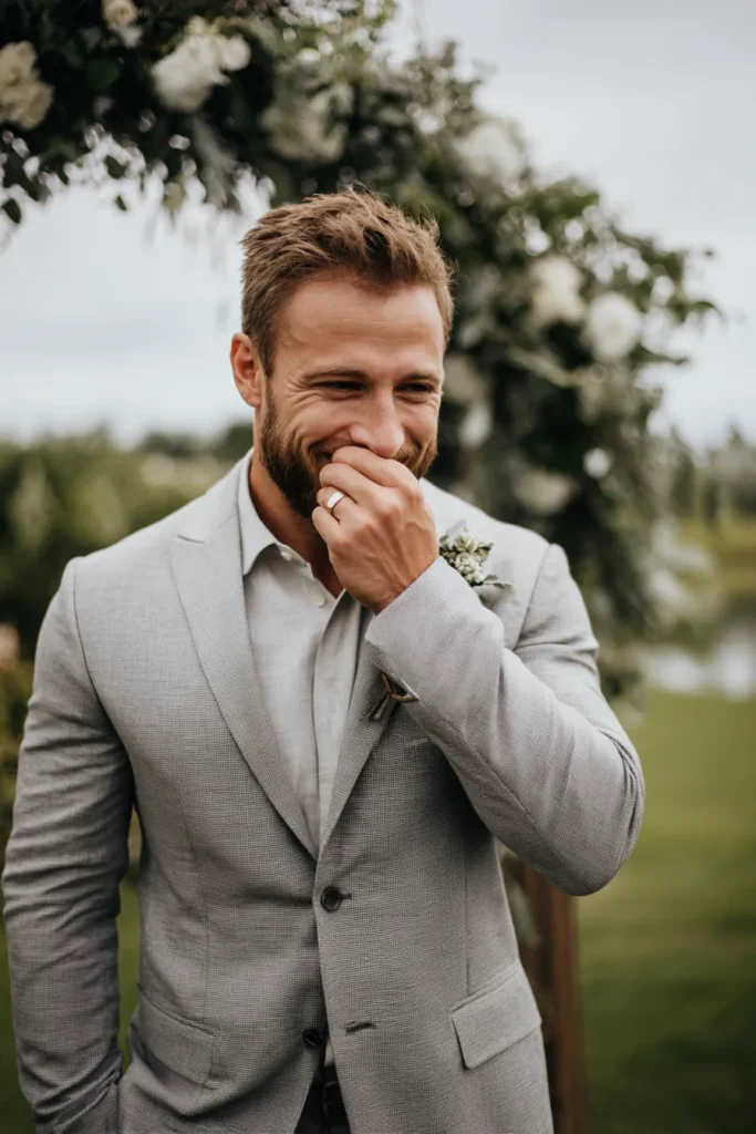 I absolutely love this spontaneous shot because it feels so full of genuine emotion and happiness, which is what wedding days are truly about. The groom’s infectious smile and the small, casual gesture of covering his mouth make it feel like a completely natural, unscripted reaction to a lovely moment during the ceremony. His light grey suit is also an incredibly chic and modern choice for a spring wedding, looking crisp and relaxed all at once. It’s the perfect photo to remember the fun, light-hearted side of your celebration.