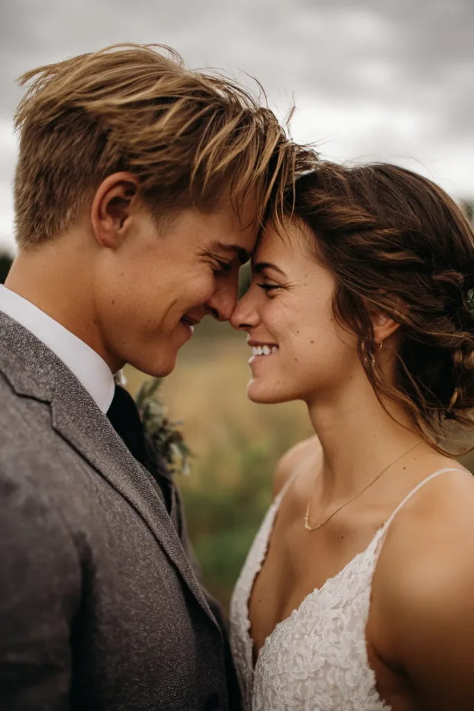 I absolutely adore this pose because it feels so beautifully genuine and tender, instantly capturing the deep emotional connection between the couple. It’s a softer, equally romantic alternative to a traditional kiss that still conveys profound love and protection. The bride’s genuine smile truly lights up the image, proving that the best wedding photos are the ones that capture authentic happiness. This intimate moment is perfect for a couple who wants their photos to feel heartfelt, romantic, and utterly timeless.