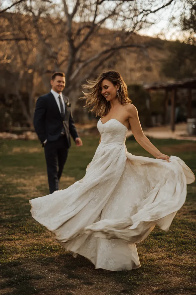 I am absolutely in love with the dramatic, artistic flair of this image because the motion blur makes the dress look like it’s floating, creating a total fairytale moment. It’s such a unique way to capture the joyous feeling of the wedding day in a way that’s completely different from a static portrait. This picture proves that embracing movement and a little bit of creative blur can result in an incredibly stunning and memorable photograph that feels both energetic and deeply romantic. If you want a fun, light-hearted shot that highlights a flowing dress, this technique is pure magic.