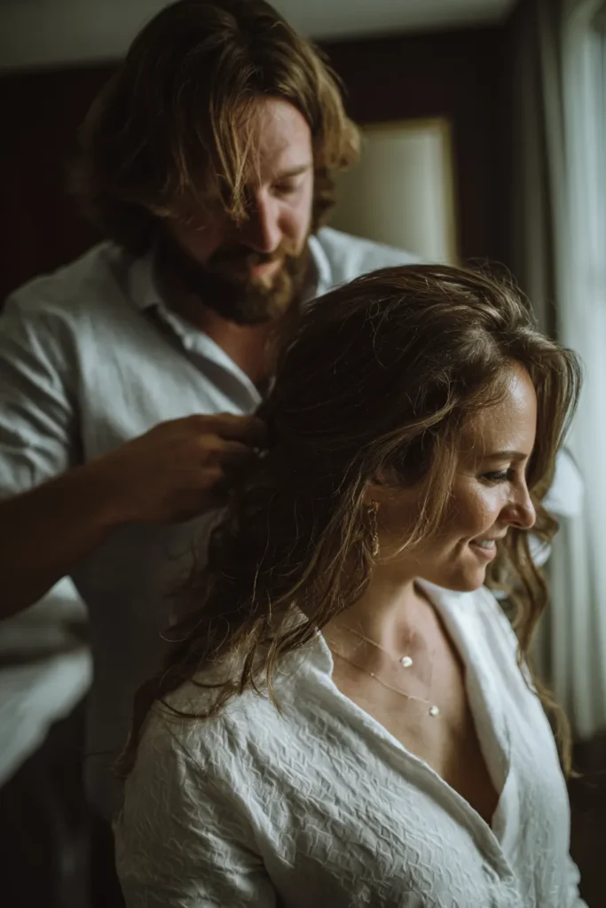 This wonderfully intimate getting-ready shot captures the sweet moment the groom is helping the bride with her hair or a hair accessory. The bride is wearing a lovely white textured getting-ready shirt and layered gold necklaces, smiling genuinely as she looks down. Her hair is styled in soft, natural waves. The groom, looking fondly down at her, is also dressed in a light-colored button-up shirt, adding to the relaxed, pre-ceremony atmosphere. The soft, natural light filtering in from the window creates a beautiful, cozy mood.
