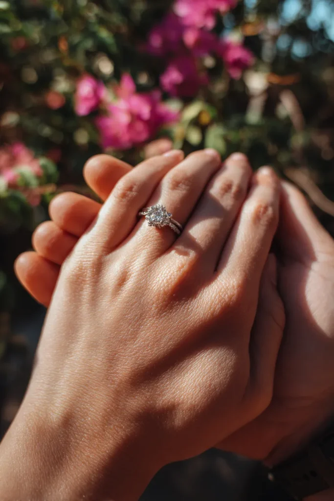 I absolutely adore this photo because it combines the essential detail of the ring with the genuine intimacy of holding hands, all wrapped up in that gorgeous spring atmosphere. Using the bright, blurred flowers as the background is such a clever and beautiful way to make the ring pop without it looking staged or formal. It’s a sweet, simple pose that perfectly symbolizes the commitment and romance of the moment. This is definitely a must-have shot if you want to feature your engagement ring in a charming and romantic way.