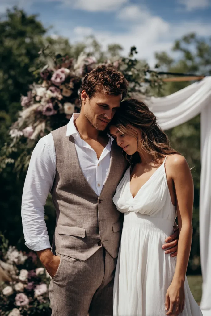 This portrait beautifully captures a moment of tranquil intimacy, with the bride leaning her head gently onto the groom’s shoulder. The bride is wearing a flowy, white V-neck dress with spaghetti straps, her hair styled in soft, romantic waves half-up, half-down. The groom looks incredibly stylish in a relaxed yet refined light brown tweed or linen vest and trousers with an unbuttoned white shirt, one hand casually in his pocket and the other around his bride. The outdoor ceremony backdrop features a gorgeous floral arrangement with dusty rose and white blooms, soft pampas grass, and a draped white sheer fabric arch.