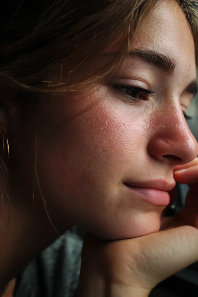 This intensely focused close-up captures a beautifully raw and pensive moment, showcasing the bride’s natural skin texture and glowing complexion. Her face is softly illuminated from the side, with her hand gently resting under her chin in a thoughtful pose. The lighting highlights a soft rosy flush on her cheeks and a natural reddish hue to her subtle freckles across the bridge of her nose. Her makeup is minimalist, focusing on softly defined brows and a clear gloss on her lips, and she wears a simple gold hoop earring.