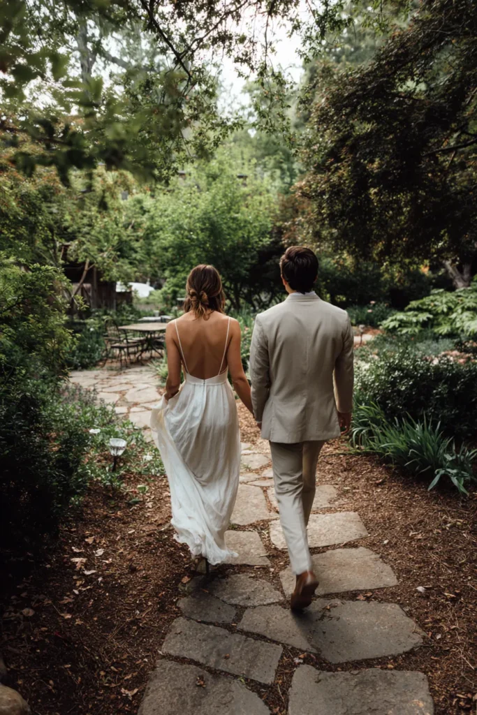This beautiful full-length shot captures the newlywed couple walking hand-in-hand down a flagstone path, disappearing into a lush, green, overgrown garden setting. The bride’s flowing white dress has delicate spaghetti straps and a dramatically low back, creating a gorgeous contrast with the groom’s chic, light tan or beige suit. Her hair is in a relaxed, low updo. The image is taken from behind, emphasizing the romantic and intimate act of starting their new journey together in a stunning, natural environment.