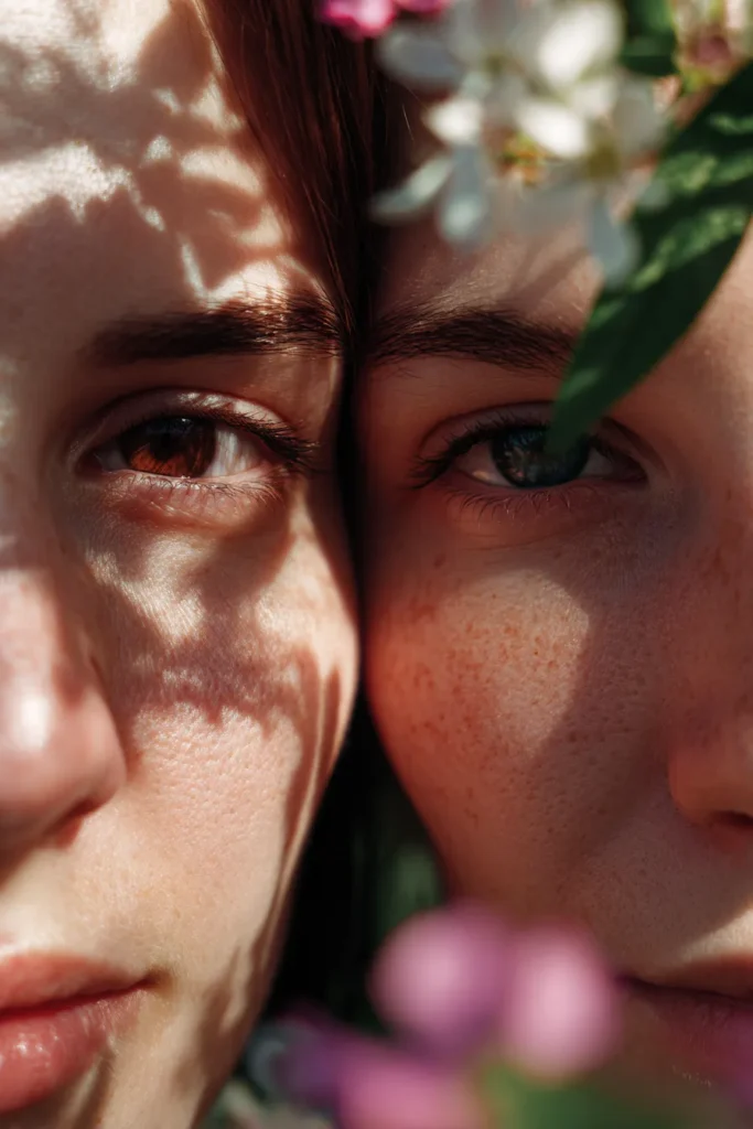 This incredibly intimate and artistic close-up focuses solely on the faces of the couple pressed together, creating a powerful, single visual unit. Their features are highlighted by dramatic, dappled sunlight filtering through leaves, casting striking shadow patterns across their skin. The extreme close-up allows you to appreciate the details of their individual eye colors and the natural texture of their skin, including the bride’s charming freckles. The foreground is softly blurred with white and pink blossoms, perfectly framing the shot.