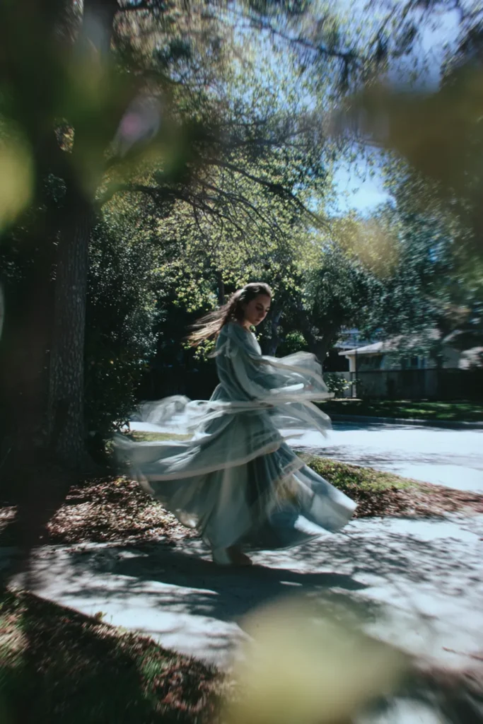 This captivating photograph uses a beautiful motion blur effect to showcase a woman, possibly a bride in a light blue or pale grey flowing dress, twirling in a sun-dappled outdoor setting. The movement is central to the image, with the layers of the sheer dress skirt and long sleeves appearing gauzy and ethereal as they spin around her. The natural light filtering through the early spring foliage and the framing of the trees on the sides create a dreamy, almost whimsical atmosphere around her.