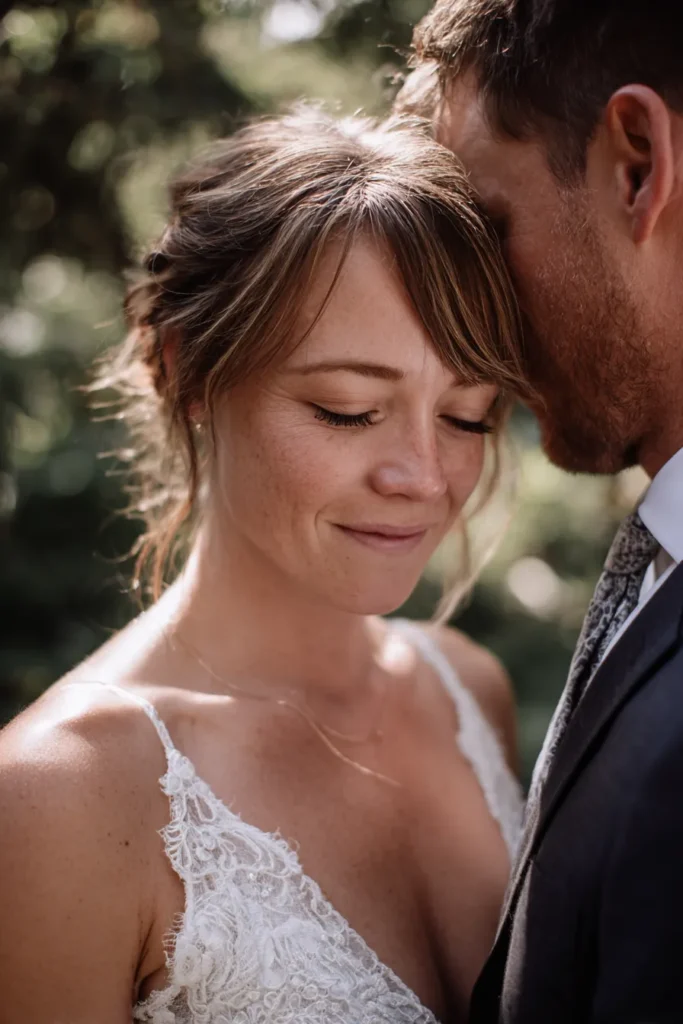 This incredibly close and tender portrait captures the bride and groom sharing a quiet, intimate moment, with the groom resting his forehead against the bride’s. The bride’s eyes are softly closed and she’s holding a gentle smile, while the groom is partially visible, dressed in a dark suit and patterned tie. Her dress features beautiful lace details on the bodice and delicate spaghetti straps, and she wears a simple gold necklace. Her makeup is natural, allowing her lovely freckles and a touch of sun-kissed blush to shine, and her hair has soft bangs and is styled in a relaxed updo.