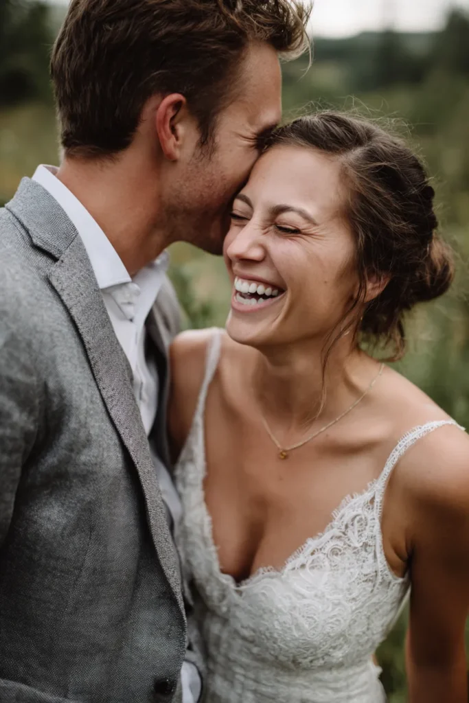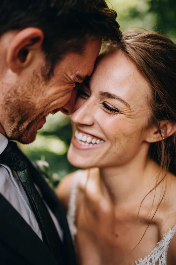 I just adore how unscripted and full of happiness this moment feels, instantly capturing the fun and deep connection between the couple. It is such an incredibly personal and joyful expression that truly makes the photograph come alive and feel uniquely theirs. This is a must-try pose because it beautifully showcases those natural, effortless emotions of the day, proving that sometimes the best moments are the unexpected ones. The close composition also makes the connection between them feel so powerful and perfectly romantic.