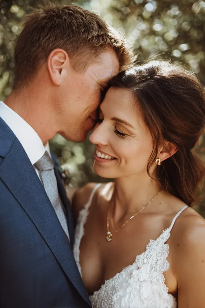 This beautiful close-up captures a deeply intimate and sweet moment between the bride and groom, with the groom affectionately leaning in for a forehead kiss. The bride’s face is illuminated, showing her eyes closed and a radiant smile of pure happiness. She is wearing a gorgeous lace gown with delicate spaghetti straps, paired with a charming cluster necklace and small gold hoop earrings. The groom looks very sharp in a dark navy blue suit with a light grey tie, creating a handsome contrast with the bride’s white lace. The setting is a lush, sun-dappled outdoor space.