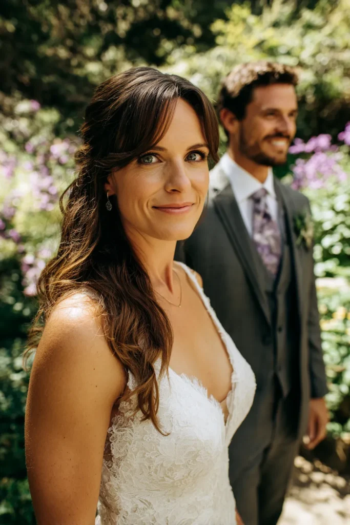 This gorgeous portrait features the bride front and center, looking confidently towards the camera, with the groom positioned just slightly behind her, looking off to the side with a happy smile. The bride is wearing a stunning white lace dress with a deep V-neck and has her long hair styled in a chic half-up, half-down look with soft waves and bangs. She is simply accessorized with a delicate necklace and small drop earrings. The groom is dressed in a dark grey suit and a patterned tie that features purple or lilac tones, adding a pop of color that complements the purple blossoms in the lush, sunlit garden backdrop.