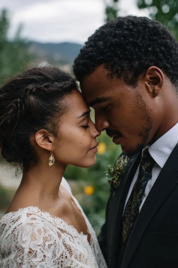 I think this pose is absolutely stunning because it captures such a deep sense of connection and peacefulness right before or after the ceremony. Closing their eyes makes the moment feel completely authentic and private, drawing you into their intimate bubble. It is incredibly romantic and feels chic and elevated thanks to the beautiful contrast between the bride’s delicate lace and the groom’s striking dark suit and patterned tie. This picture is proof that the quiet moments often hold the most meaning and look the most powerful.