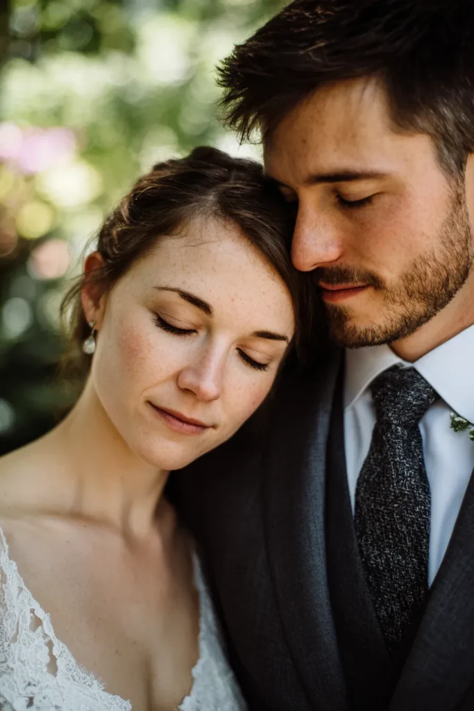 I find this pose incredibly powerful because it captures a feeling of comfort, security, and deep emotional bond in such a simple, beautiful way. The fact that both their eyes are closed makes the moment feel completely authentic and private, showing that they are fully present with each other. The contrast of the bride’s soft lace and the groom’s textured suit and tie is so effortlessly chic and perfect for a cozy, romantic spring wedding. This picture is a perfect, timeless encapsulation of their quiet love and connection.