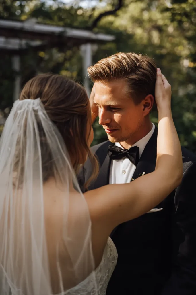 This wonderfully intimate and candid portrait captures a tender moment where the bride is gently fixing the groom’s hair, framed over her shoulder with her soft, mid-length veil flowing in the foreground. The bride is wearing a detailed lace wedding dress with a deep sweetheart neckline and her hair is styled in a loose, romantic updo. The groom looks dapper in a black tuxedo with a black bow tie, gazing down at his bride with a soft, affectionate expression. The outdoor light and the lush greenery in the background create a relaxed yet deeply romantic setting.