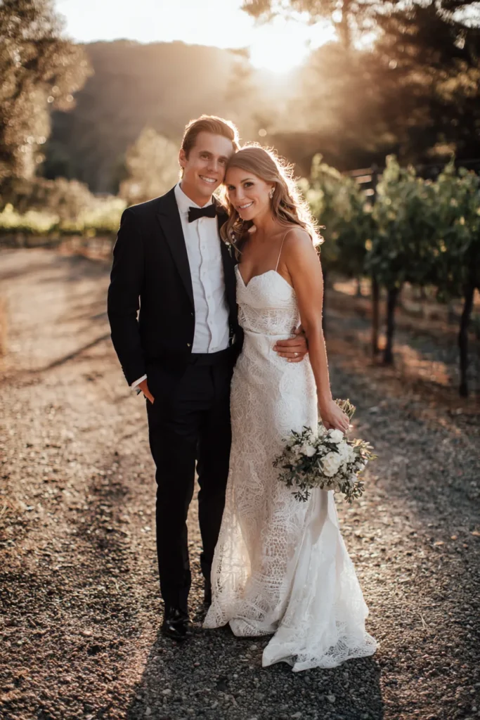 I am completely obsessed with the romantic, golden hour lighting in this photo because it adds such a dreamy and ethereal quality to the whole scene. This classic, simple pose, standing close and smiling at the camera, beautifully highlights the elegance of the formal outfits while still keeping the mood warm and joyful. The contrast between the bride’s intricate lace and the groom’s sleek black tuxedo is so chic, making this a timeless and stunning portrait that perfectly captures the magic of their wedding day.