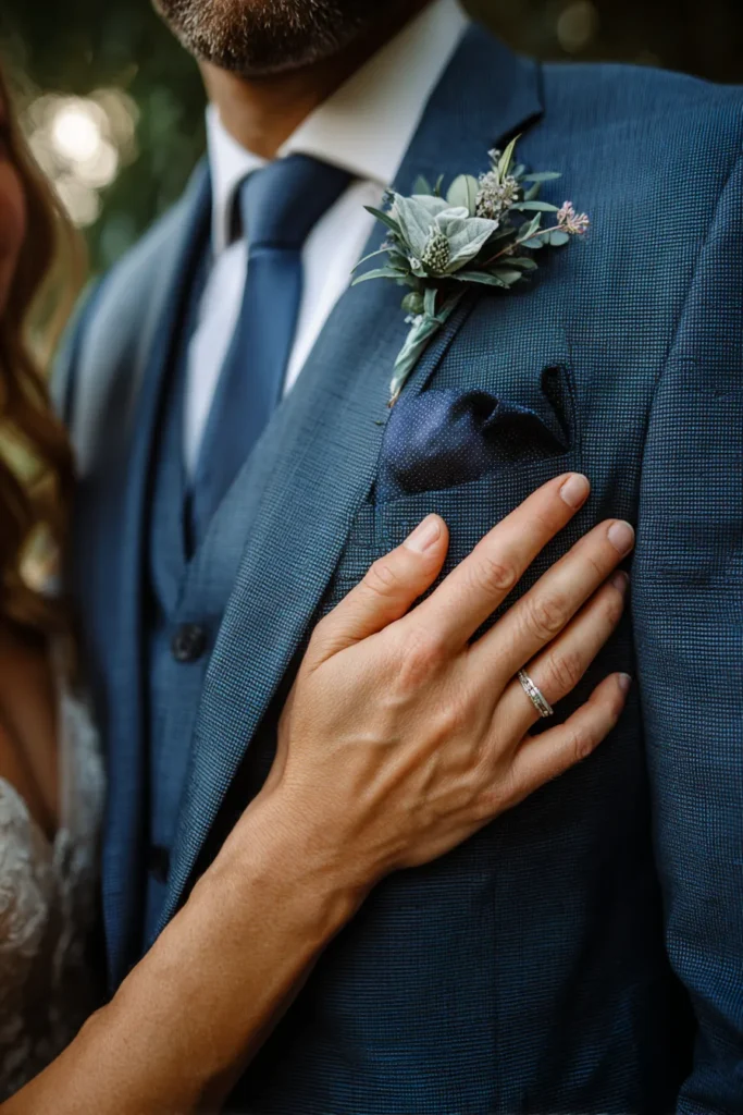 This captivating close-up focuses on the detail of the bride’s hand resting gently on the groom’s chest, prominently showcasing her wedding band and the gorgeous texture of his suit. The groom is dressed in a striking blue-textured suit jacket, waistcoat, and a matching solid blue tie, complemented by a simple, elegant boutonniere of dusty miller and thistle. A navy polka-dot pocket square adds another layer of texture. The bride’s delicate lace from her dress is just visible at the edge of the frame.
