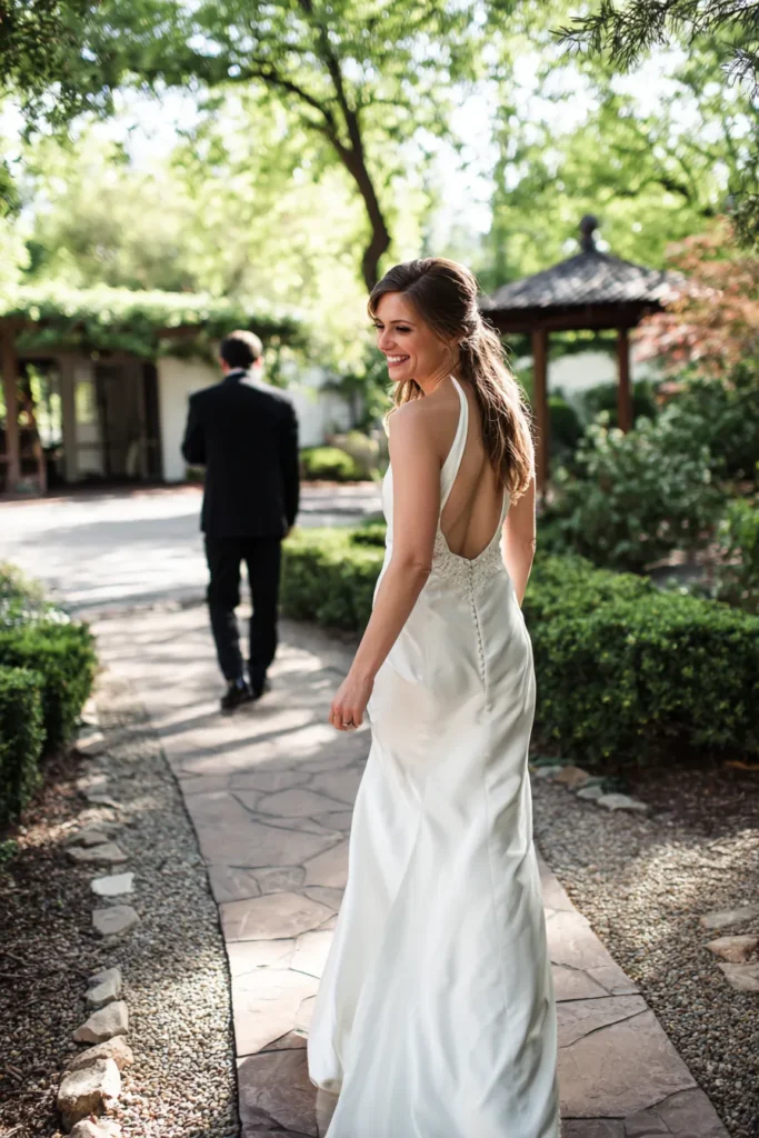 This beautiful full-length portrait captures a moment of pure joy as the bride looks back and smiles genuinely at the camera while walking away from it. She is wearing an elegant, simple silk or satin gown with a high halter neckline and a dramatically low, open back accented by a delicate line of buttons. Her groom is visible in the distance, walking ahead in a classic dark suit. They are walking along a stone-paved pathway lined with lush green hedges and trees in an outdoor garden setting.