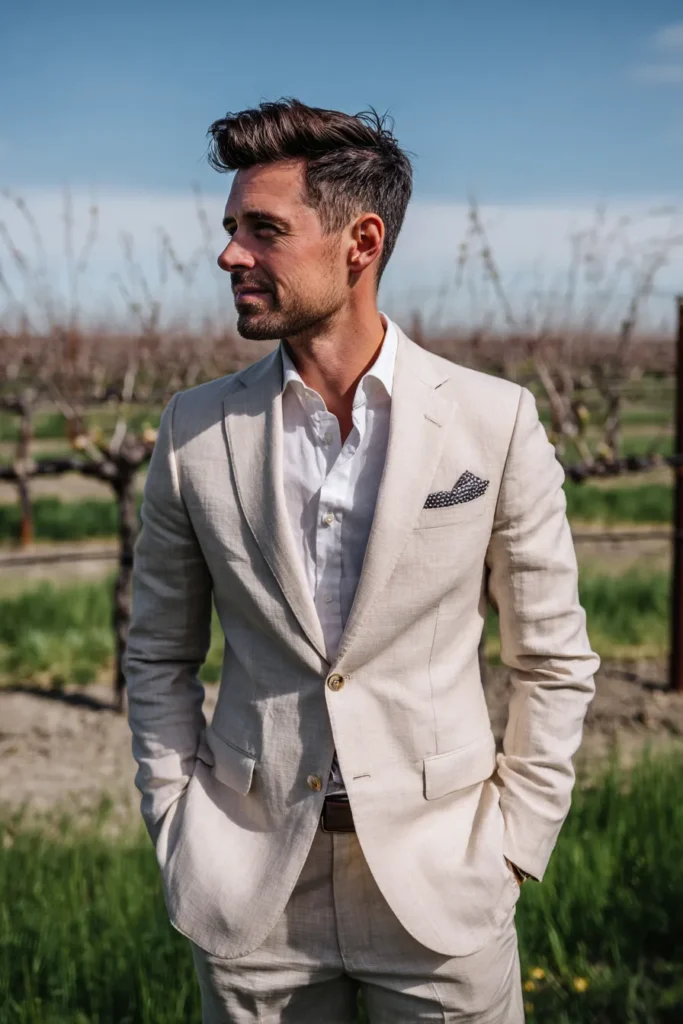 Now this is how you nail that effortlessly cool groom style for a warmer spring wedding. The linen fabric is just fantastic because it looks sharp but keeps him cool, which is a major win for any outdoor event. Skipping the tie makes the whole look feel modern and approachable, and that subtle pocket square adds just the right hint of personality without being too fussy. He looks totally comfortable and incredibly stylish.