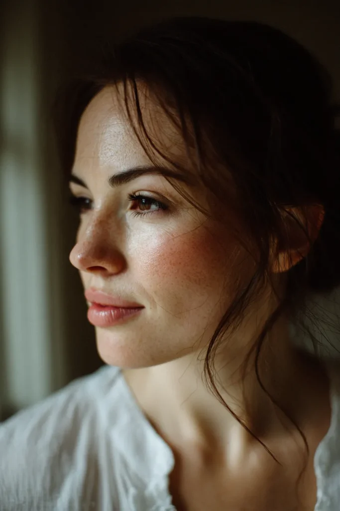 This close-up profile shot highlights a bride with beautifully natural makeup, set against soft, dim lighting that contrasts with a bright highlight on her cheekbone and forehead. Her dark hair is styled loosely, framing her face with soft tendrils. Her complexion shows natural freckling, complemented by a gentle rosy flush on her cheeks and a glossy, nude-pink lip color. She is wearing what appears to be a simple white blouse with delicate detailing near the neckline.