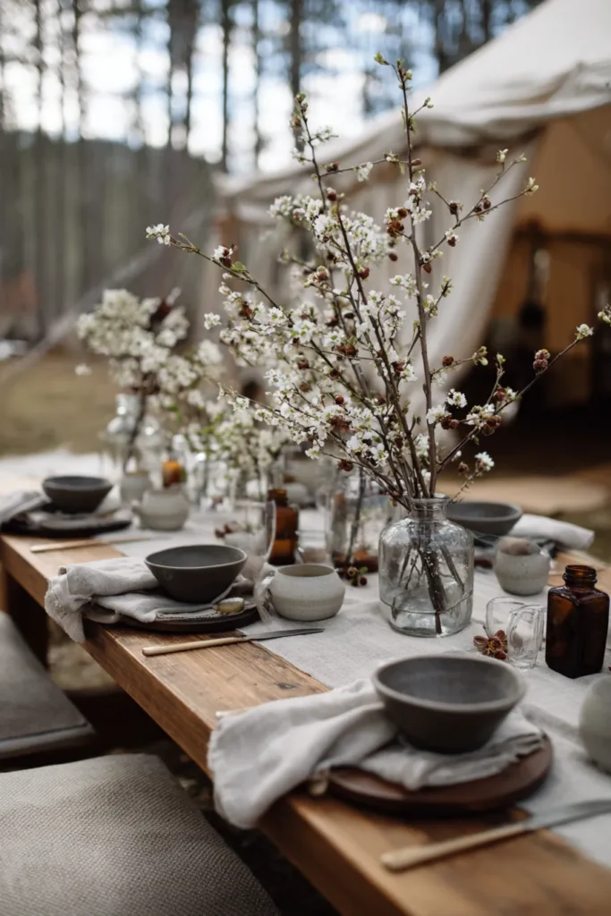 I am completely charmed by how earthy and beautifully textured this setting is, it feels so grounded and intimate. Using those blooming branches is such a clever nod to early spring when not everything is fully green yet, and the muted earth tones are just gorgeous. It looks like the most wonderful, cozy dinner party is about to happen in the woods, and I want to pull up a chair right now.