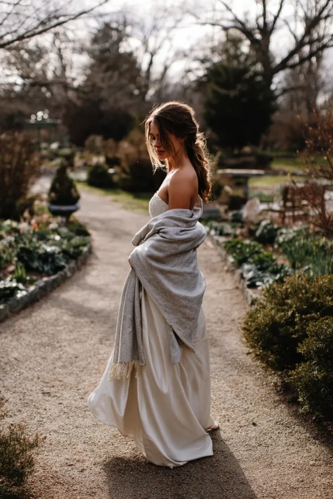 I think this is such a smart and stylish idea for a March wedding when you want the beauty of an outdoor venue but still need some warmth. The texture of that cozy wrap against the smooth silk of the dress is just divine, adding layers of elegance instead of bulk. It makes for such a moody and romantic photograph, proving you can be perfectly chic even when you need an extra layer for those cool early spring moments.