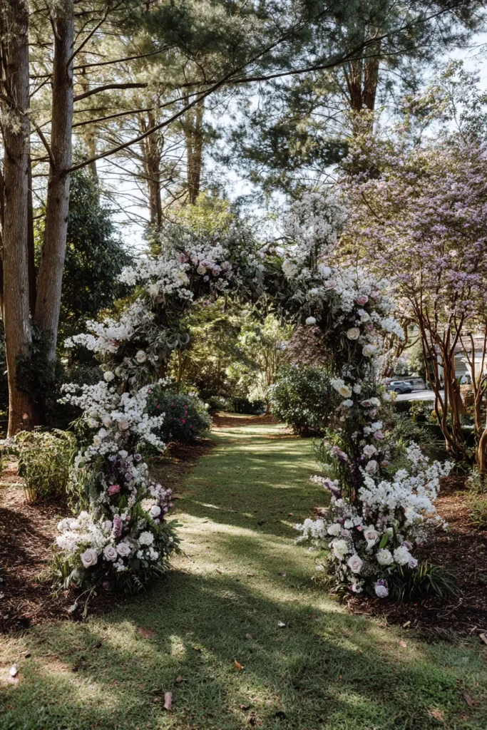 This picture showcases a truly magnificent garden ceremony arch creating a breathtaking entrance. The arch is heavily adorned with an overflowing abundance of white and blush pink flowers, mixing large roses and peonies with delicate, wispy white blooms and rich, varied greenery. It stands tall at the end of a grassy aisle, flanked by trees and shrubbery, creating a beautiful focal point in a natural outdoor setting.