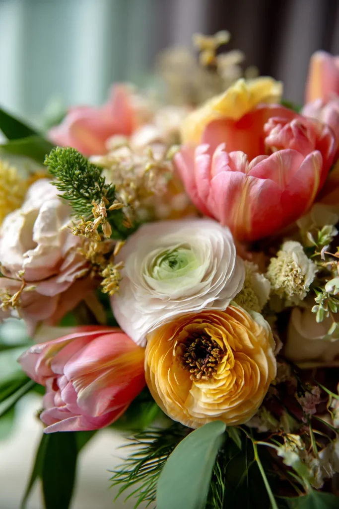 This is a vibrant close-up of a bridal bouquet showcasing the warm, cheerful colors perfect for shaking off the winter gloom. The arrangement features gorgeous ruffled blooms like creamy white ranunculus, deep yellow/orange ranunculus, and tulips showing beautiful coral and pink gradients. These brighter focal flowers are balanced with airy white fillers and small touches of fresh, bright green foliage, like a tiny piece of pine.