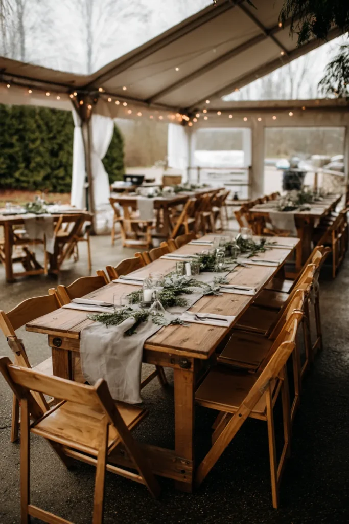 This reception setup is sheltered under a clear-topped tent, suggesting a cozy gathering even on a damp or overcast day typical of early spring. The tables are long, rustic wooden planks paired with simple wooden folding chairs, creating a farmhouse aesthetic. The tables are dressed with a pale gray fabric runner, dotted with simple greenery garlands, votive candles, and dark stoneware, blending seamlessly with the surrounding tall, dark trees visible through the tent walls.