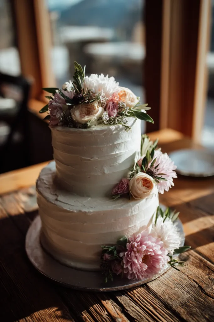 This lovely two-tiered wedding cake features a simple white buttercream frosting applied with textured horizontal lines, giving it a slightly rustic and homemade charm. It is elegantly adorned with fresh flowers clustered cascading down the side and crowning the top layer. The floral elements include soft blush garden roses, fluffy pink dahlias, white chrysanthemums, and subtle greenery, all set against a warm, sunlit wooden table.