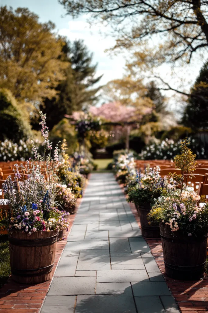 I am absolutely loving how this decor embraces the early signs of spring beauty, it feels so fresh and alive even before the full bloom arrives. Using those potted arrangements on the ground instead of scattered petals keeps the path clear but still brings incredible color right where we are walking. It’s such a charming and visually impactful way to lead the eye right down the aisle to the “I do” moment.