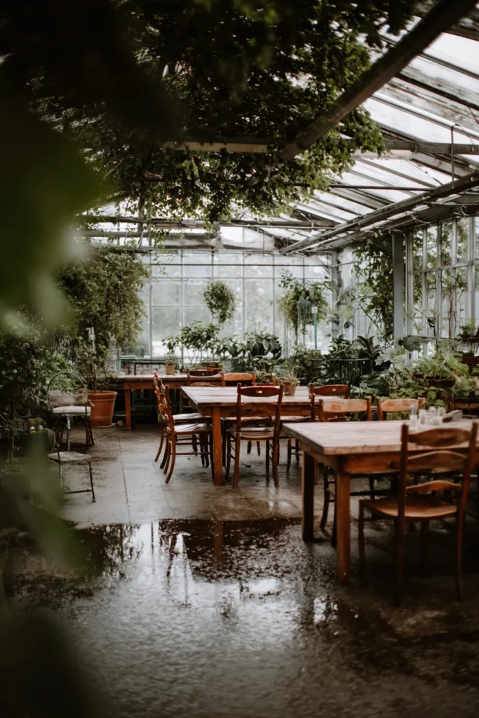 I seriously want to host my next big event here because it has such an incredible moody and romantic vibe, it’s perfect for when you want the garden feel without worrying about the March chill. The way the light filters through the glass roof and reflects off the wet floor is just pure magic in photographs. It feels unique and incredibly intimate, like a secret garden party just waiting to happen.