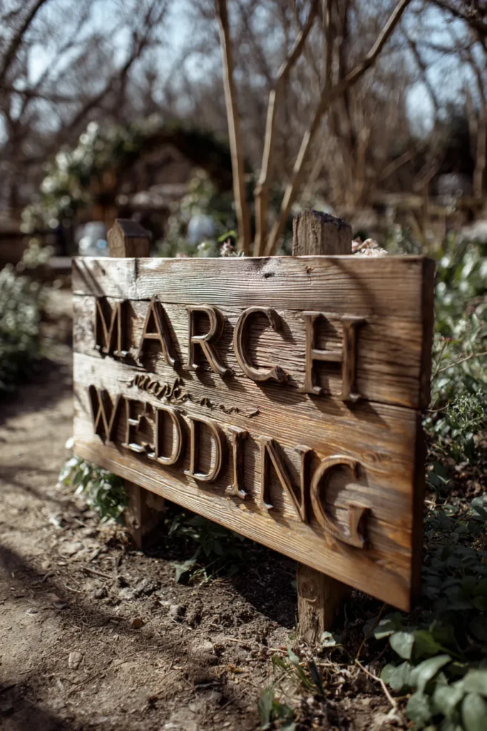 I absolutely love this sign because it perfectly captures the spirit of a beautiful March wedding where the landscape is just waking up. The deeply carved wooden letters give it such a lovely, substantial, rustic feel that looks amazing in the bright sun. It’s such a gorgeous piece of decor that sets a warm and welcoming tone for a wedding happening just as the seasons change.