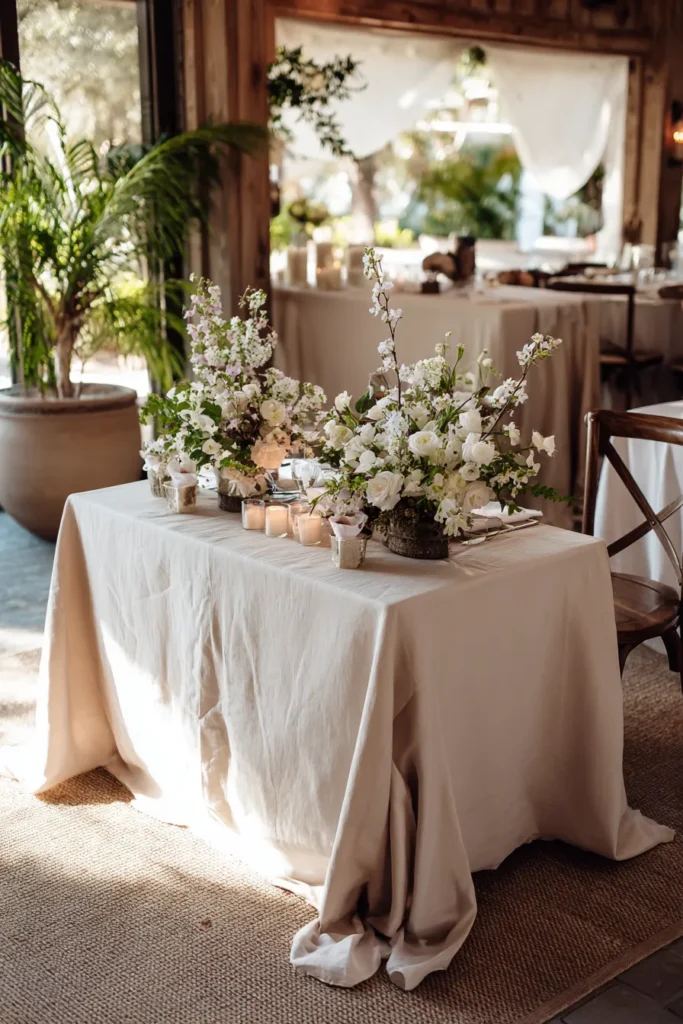 This image focuses on a beautiful reception table dressed in a floor-length, flowing natural linen tablecloth, set inside a bright venue with large windows overlooking greenery. The centerpiece features dramatic floral arrangements bursting with white roses, blush accents, and tall, airy white blossoms in earthy, low vases. Scattered votive candles add a warm glow along the runner, creating an atmosphere of refined elegance on the jute rug below.